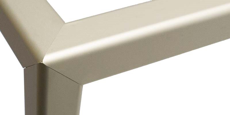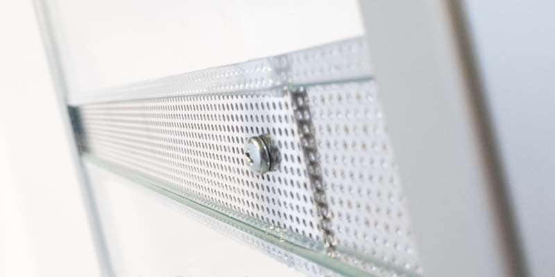 Tillverkat i 6 mm glas med aluminiumprofiler som förstärker och skyddar hörn och kanter. Ventilation finns på ena sidan samt i taket, skyddat av metallgaller. Sidogallret hålls ihop med skruv och mutter, vilket gör det möjligt att skapa en öppning för sladdar till lampor, värme eller andra tillbehör. Dörrarna löper i plastlister med e-profil för smidig åtkomst.