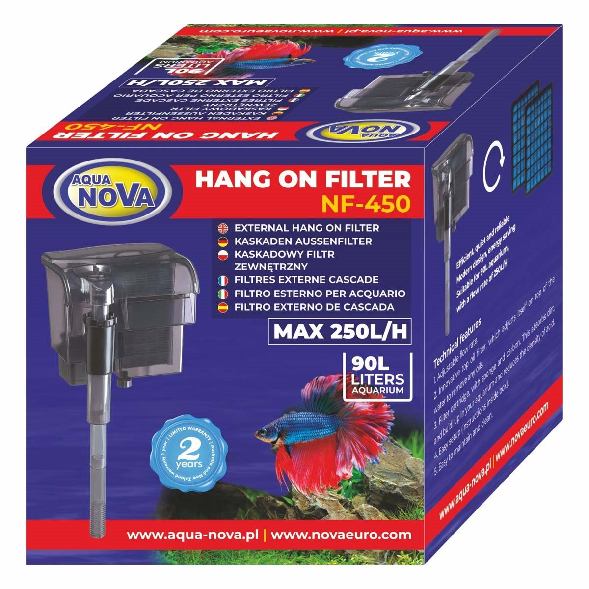 Aqua Nova NF-450 är ett påhängsfilter som enkelt sköter filtrationen i akvarium upp till 90 liter. Påhängsfiltret sätts på akvariekanten och filterkammaren är utanför akvariet.