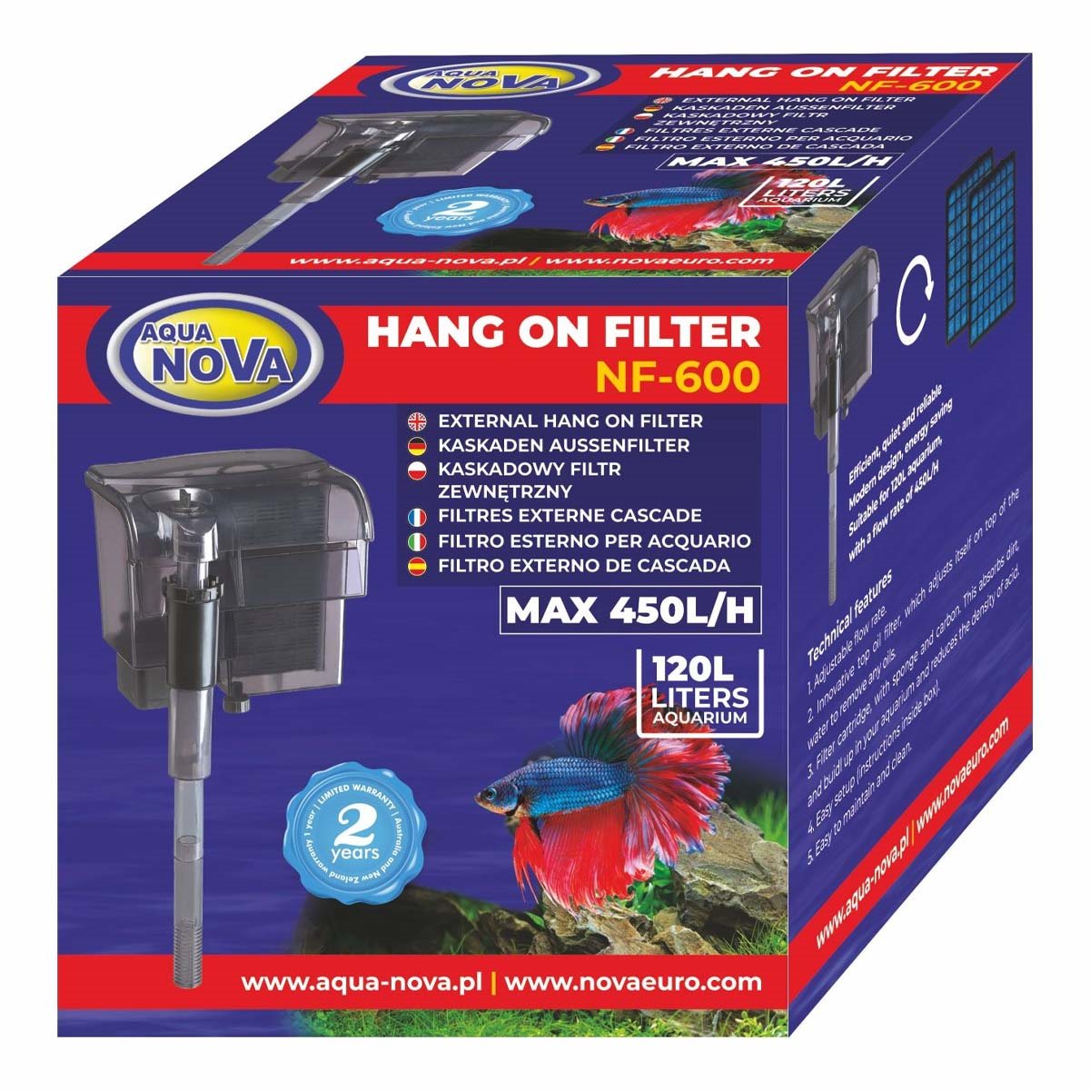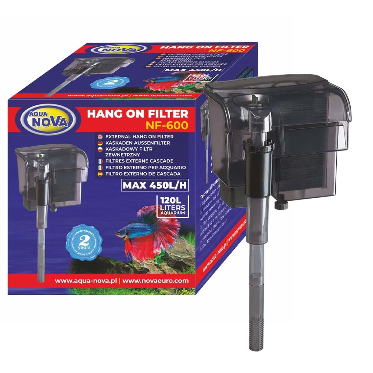 Aqua Nova NF-600 är ett påhängsfilter som enkelt sköter filtrationen i akvarium upp till 120 liter. Påhängsfiltret sätts på akvariekanten och filterkammaren är utanför akvariet.