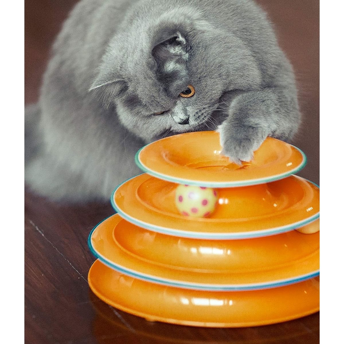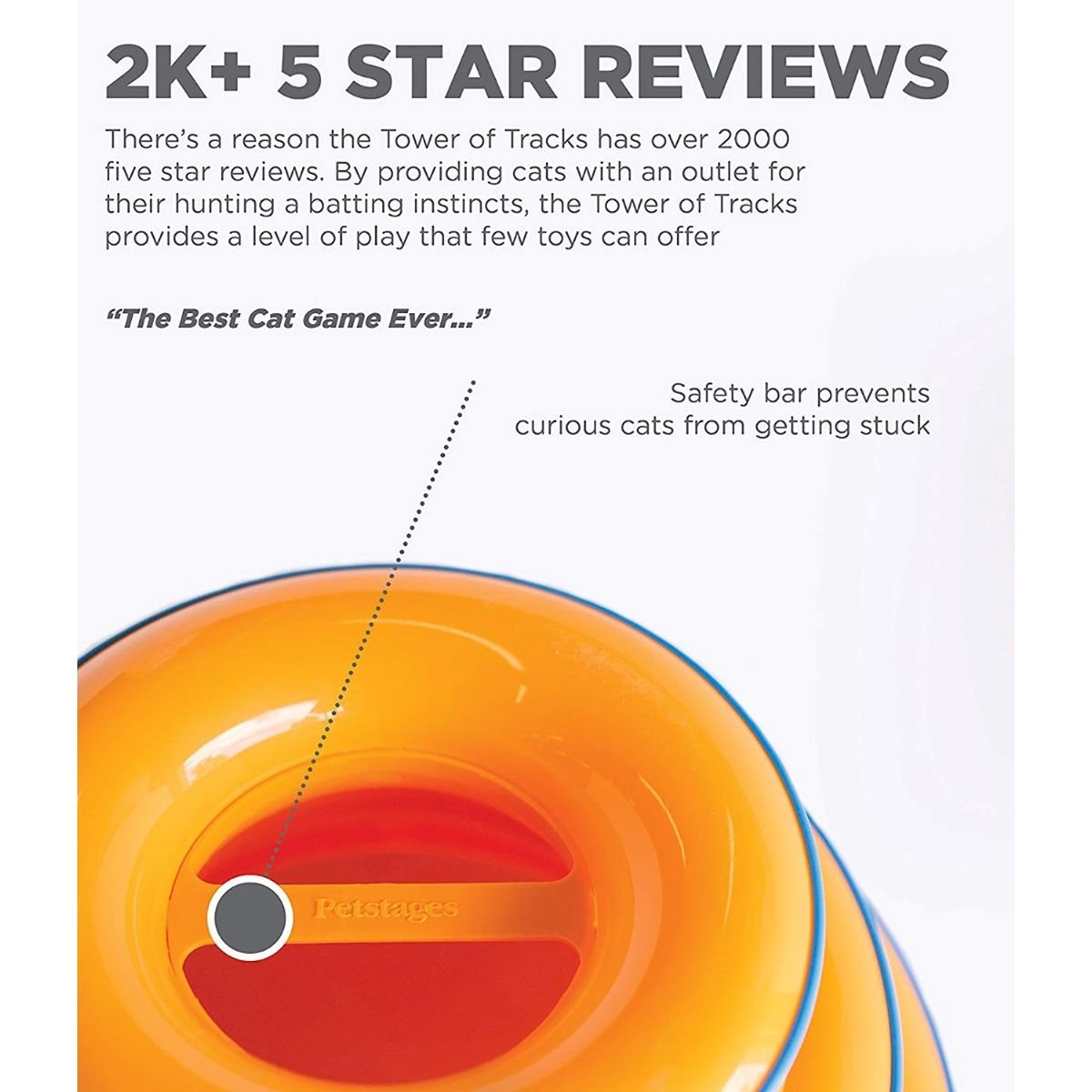 Petstages Kattleksak Tower of Tracks är en lekstation som används till att aktivera katten med tre snurrande banor. Varje nivå har en färgad boll som rör sig runt när katten slår på den, vilket ger mental stimulans och uppmuntrar till lek. Den stabila konstruktionen och antiglid-botten gör att leksaken står kvar även vid mer intensiv lek, och den passar bra för både en och flera katter.